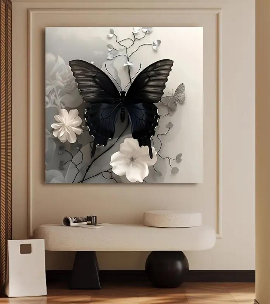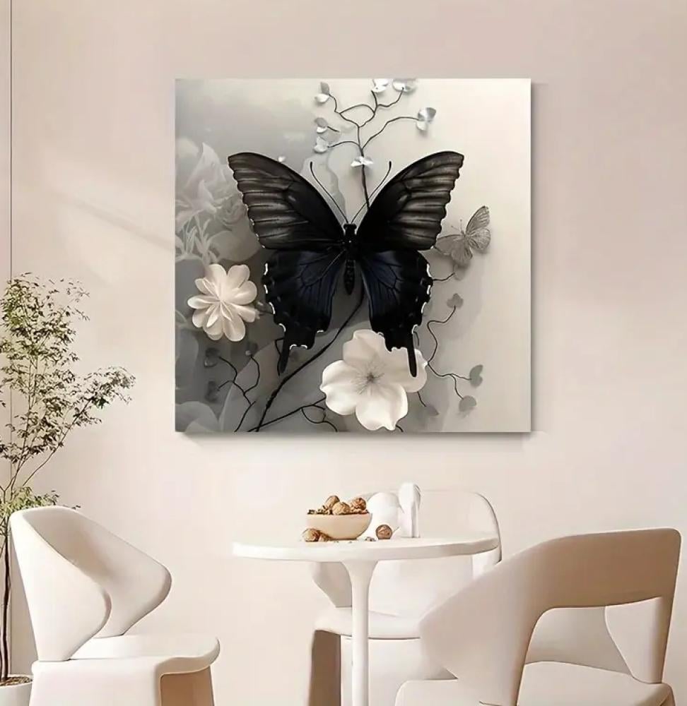 - تصميم فريد يجمع بين التباين والانسجام: الفراشة السوداء تمنح اللوحة حضورًا قويًا، في حين تضيف الزهور البيضاء لمسة رقيقة ومتوازنة.